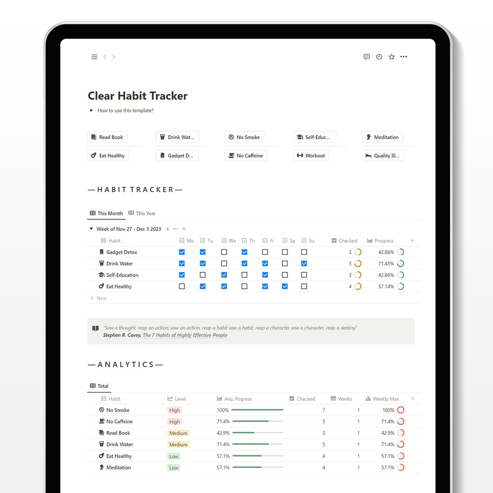 Track your habits effortlessly with Clear Habit Tracker. Our user-friendly Notion Template is designed to make habit tracking a simple and streamlined experience.